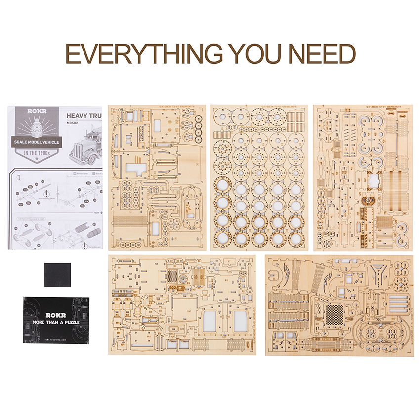Robotime-ROKR 3D wooden puzzle Heavy Truck MC502 is a 1:40 scale model self-building kit. It is a robust and heavy vehicle with a realistic mechanism. Build your roaring truck, and let it take you to the wild road.