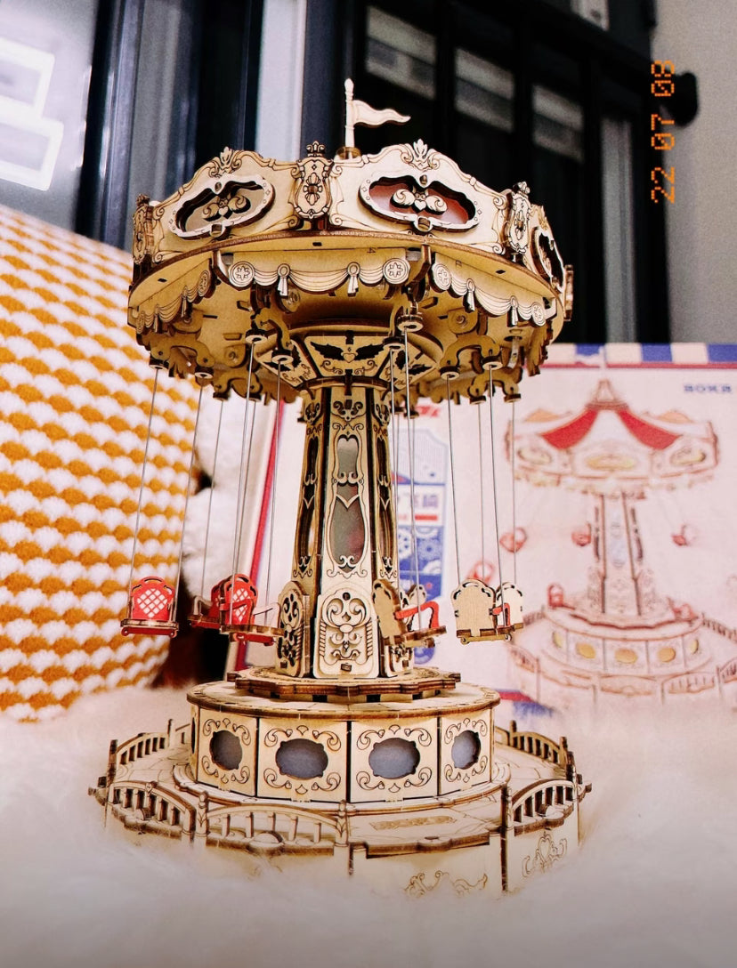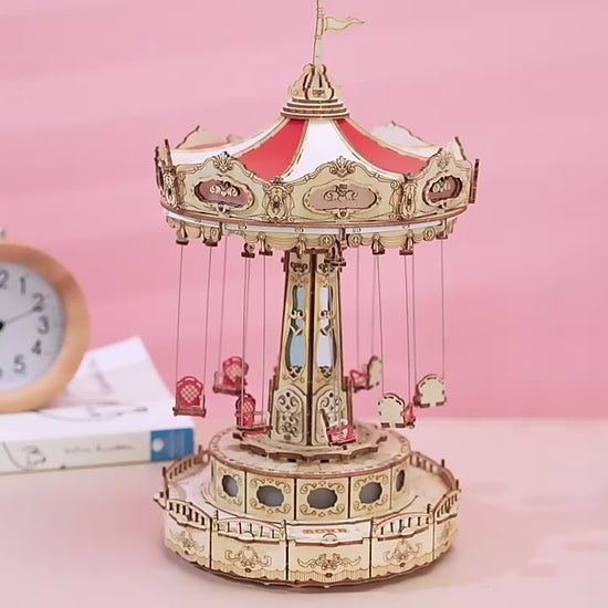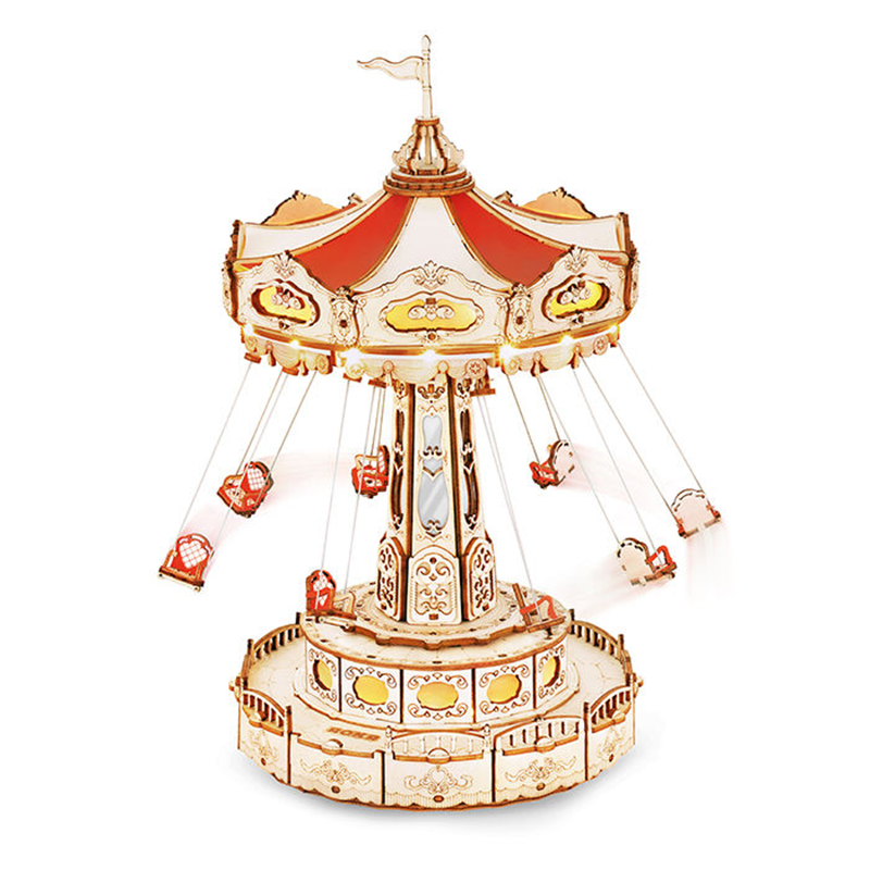 Parque de atracciones mágico Robotime Rokr, columpio, juego de construcción de rompecabezas de madera en 3D, caja de música para hacer uno mismo, kits de construcción giratorios