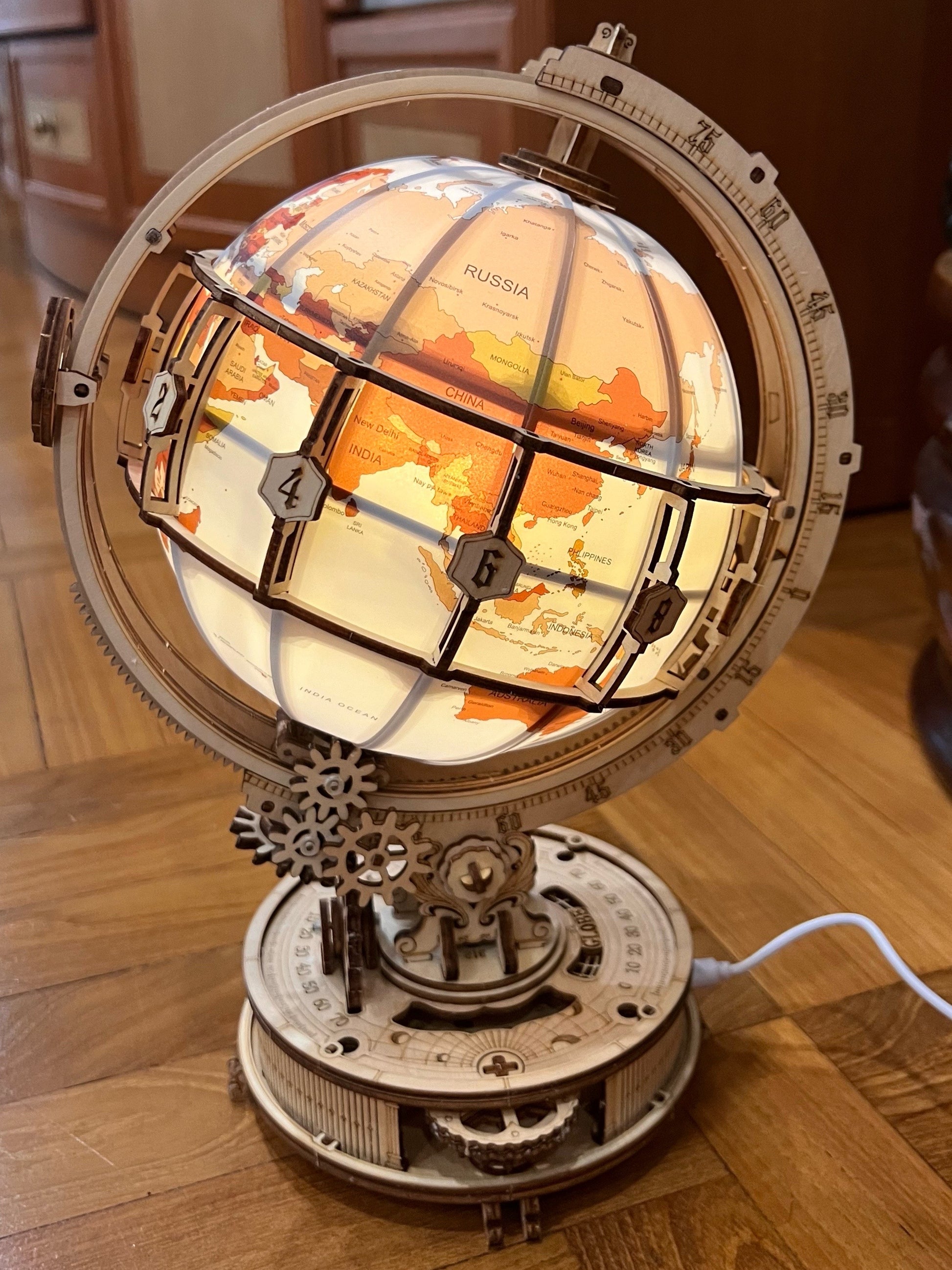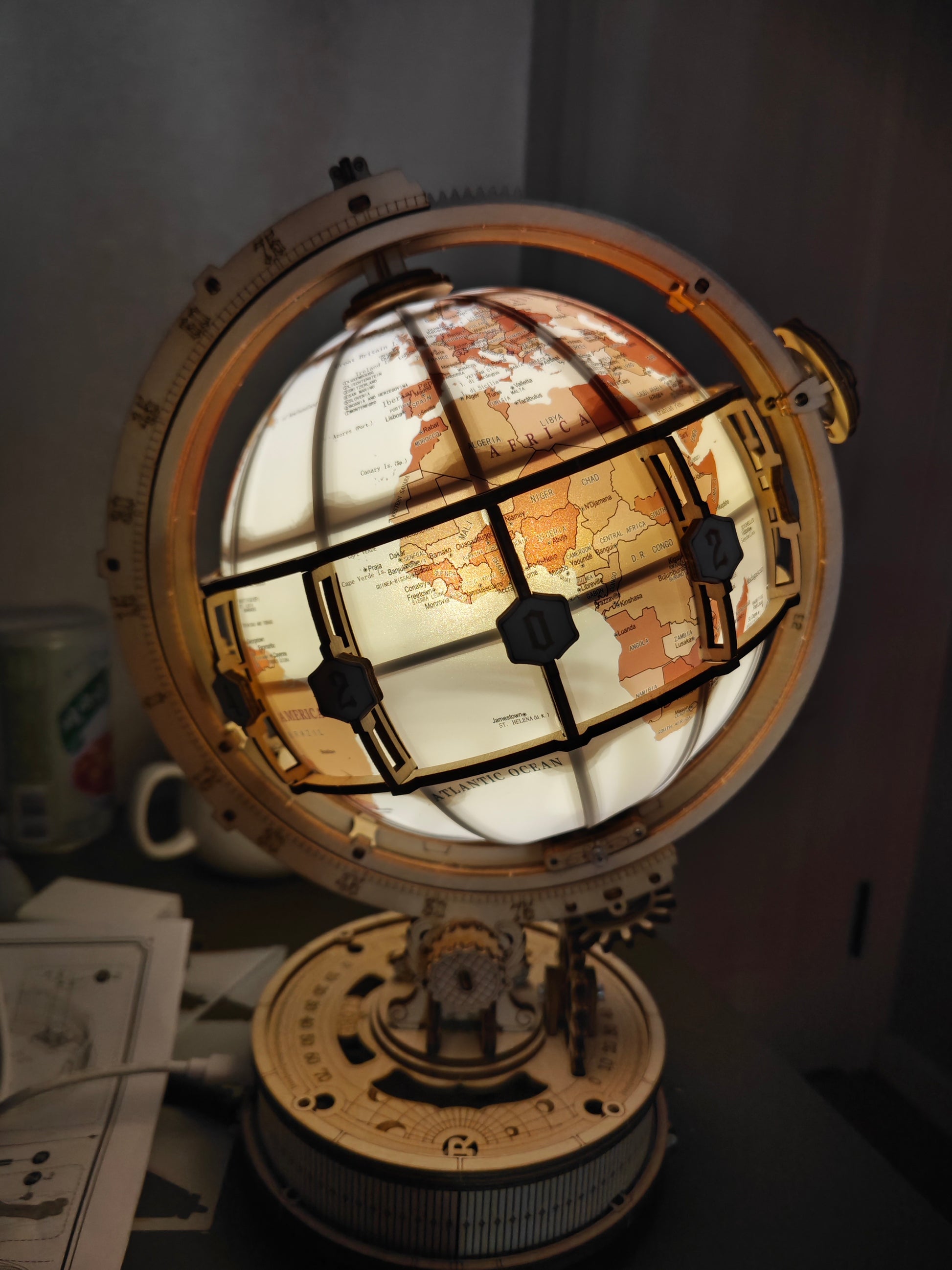 LASER CUTTING: The unique Interference Fit Process, combined with high-precision CO2 laser cutting technology, controls the error within five microns, ensuring consistent assembly accuracy under different temperature environments. NICELY DESIGNED STRUCTURES: The 25mm miniature magnifying glass allows for a better view of every detail on the globe's map. The dimensional engraving in gothic letters gives the whole piece a vintage look. The wave wheel activation structure allows you to experience a better feel when turning the globe. UNIQUE GIFT & STYLISH DECOR: A huge unique hands-on gift for any DIY lovers or any occasion like Christmas, Father's Day, Birthday. Luxury interior decor for your room and office. FEEL THE SENSE OF FULFILLMENT: Have fun in every DIY crafting from the building, crafting, or even re-decorating. It needs patience and dexterity, but also produces pleasure!